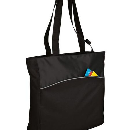 This tote has simple style and budget-friendly value. | 600 denier polyester with 420 denier dobby contrast Zippered opening, webbing handles with pen holder Curved exterior zippered pocket Dimensions: 13.75'h x 14'w x 4.25'd Note: Bags not intended for use by children 12 and under. Includes a California Prop 65 and social responsibility hangtag .