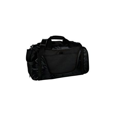 This duffel has it all when it comes to value, style and on-the-go organization. | 600 denier polyester with polyester dobby contrast Web handles with padded grip D-shaped zippered opening for easy access Detachable,adjustable shoulder strap Built-in bottom board for shape retention and strength Exterior mesh pocket Front exterior pocket with hook and loop closure Four durable, protective feet Dimensions: 11.75'h x 27'w x 10'd; Approx. 3,173 cubic inches Note: Bags not intended for use by children 12 and under. Includes a California Prop 65 and social responsibility hangtag .