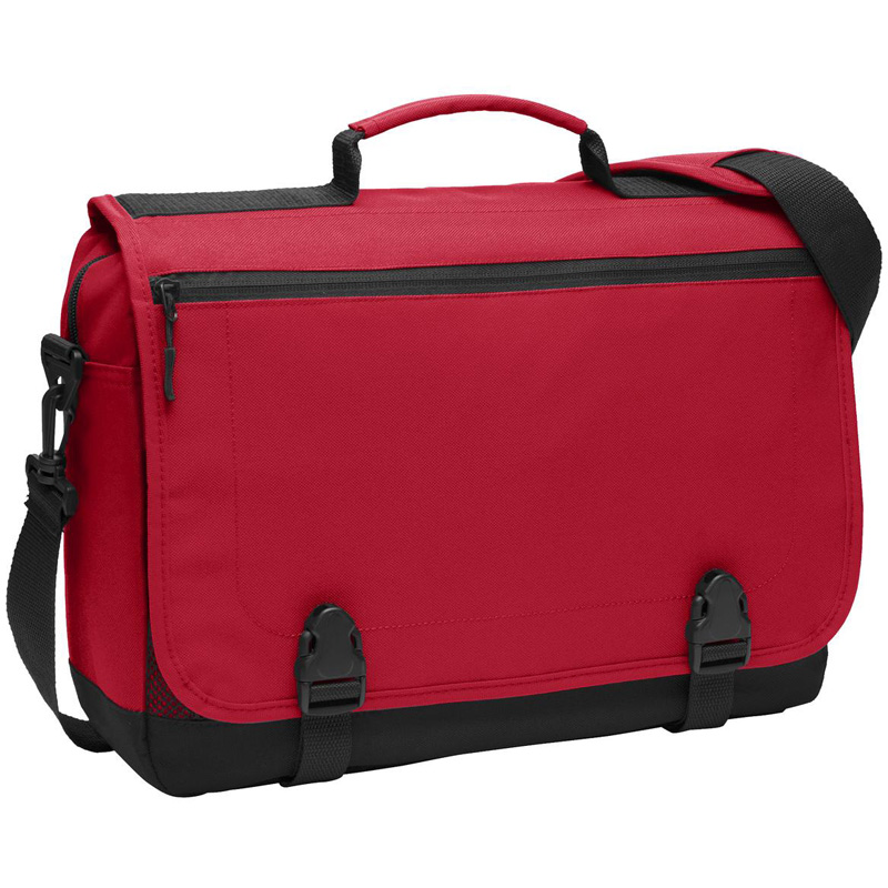 Our budget-friendly briefcase is designed to protect your laptop, organize necessities and keep you business-ready. | 600 denier polyester canvas Top carrying handle Large, padded main compartment with laptop sleeve Organization panel under flap Front slip pocket Front flap has a large zippered pocket for easy embellishment Detachable, adjustable, padded shoulder strap Dual buckle closure on front flap Laptop sleeve dimensions:8'h x 15'w; fits most 15' laptops Dimensions:12'h x 15.5'w x 4.25'd; Approx. 1,470 cubic inches Note: Bags not intended for use by children 12 and under. Includes a California Prop 65 and social responsibility hangtag .